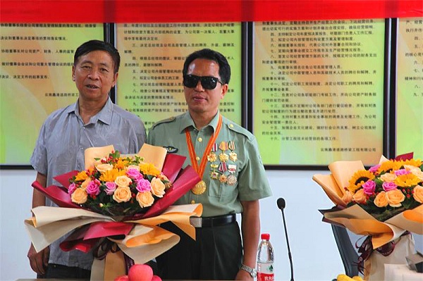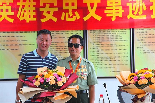 (记者 钱丙申摄影报道)8月3日早上十奌半,在东风路汇都国际二十六楼,鑫港道路桥梁有限公司的会议厅里,灯火辉煌,大幅横标上红底黄字上深深凸现着几个大字。欢迊自卫反击战英雄安忠文事迹报告会!鲜花布满讲话台,安忠文英雄走进会场。美女送上了鲜花全场鼓掌,受到热烈欢迊。此次是由,中国中非总商会云南分会执行会長,云南绿色有机食品产业协会监事长,云南民革经济总支副主委李忠良,组织民革老党员,向英雄学习!争做时代的英雄。今天到会的有民革企业家有王兼,谢敏,于秋丽,孙灿,李军,胡涛,岳全林,杨文彪',辛苑,韩献锋,李晓苹等党员同志。