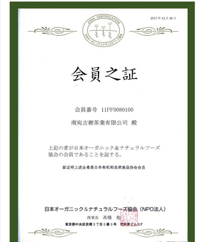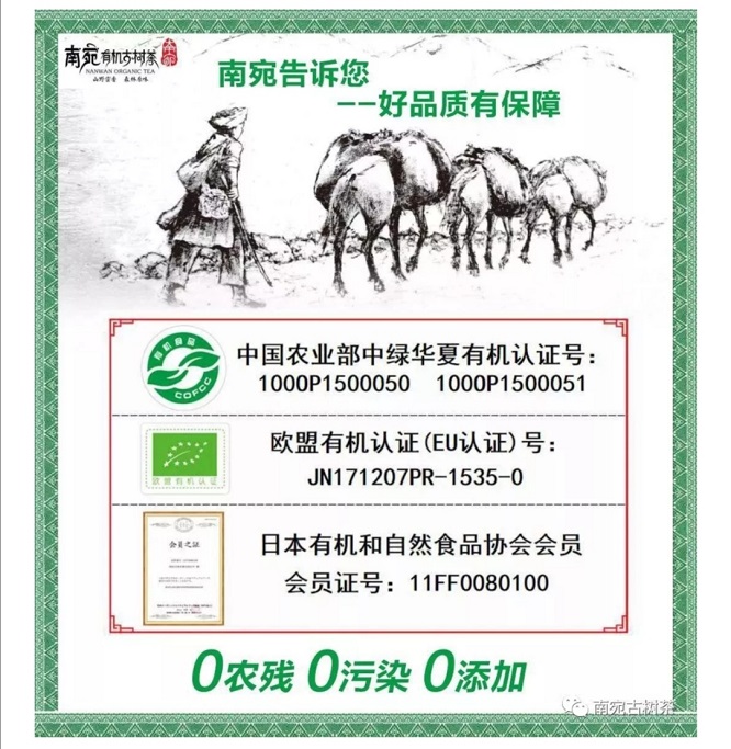 据了解,南宛古树茶业有限公司是一家从事古树普洱茶自有纯料加制作的专业公司。于2015年2月5日获得了中国农业部中绿华夏认证中心颁发的巜有机产品认证证书》,当人们品到南宛有机古树茶,彰显中国人气质与民族精神,2017年12月26日通过欧盟有机认证获得巜有机食品认证证书》,并获得巜日本有机和自然食品协会》会员资格。