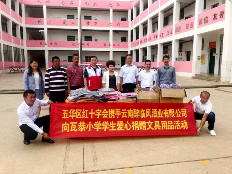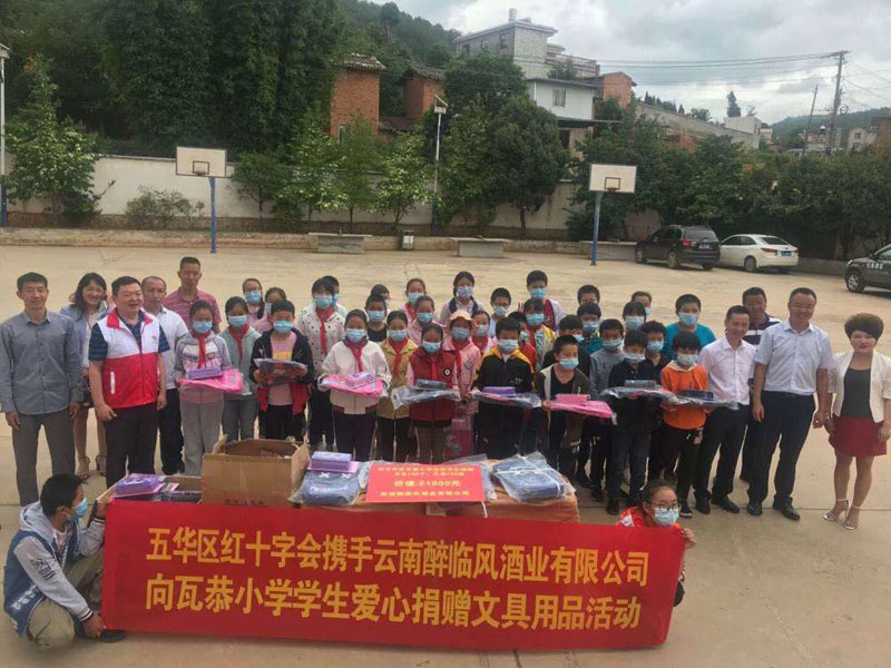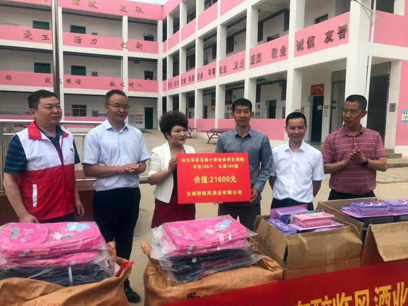 近日,云南醉临风酒业有限公司携手昆明市五华区红十字会,向五华区瓦恭小学捐赠了一批价值近3万元的书包、文具用品。据了解,瓦恭小学是昆明市五华区边远山区小学,四面环山,风景优美,颇富特色,但交通不便。现在校学生近200名(少数民族学生占到50%),分别来自12个村小组,多为留守儿童,近90%的学生为住校生。