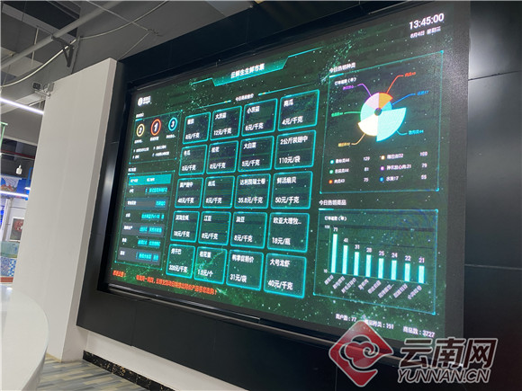 记者在云鲜生生鲜集市入口处看到,有可视化大屏幕,综合显示各种蔬菜、肉类的溯源信息,以及各类消费信息。每个商户都统一配备数据电子秤、POS机一体机、小票打印机、扫码付费硬件,确保每一笔交易进入后台大数据处理中心。