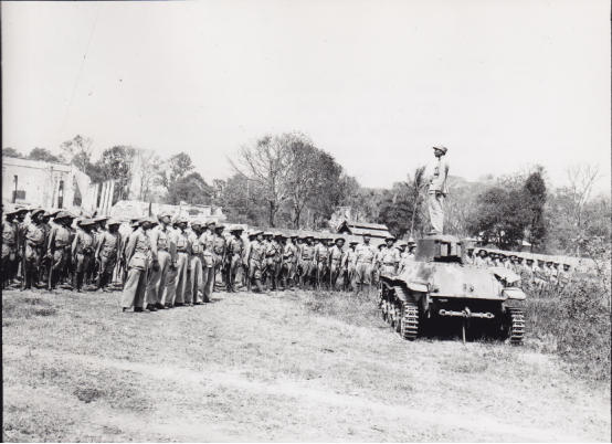 五十师师长潘裕昆将军站在缴获的日军坦克上对官兵发动员令 地点:缅甸西保
