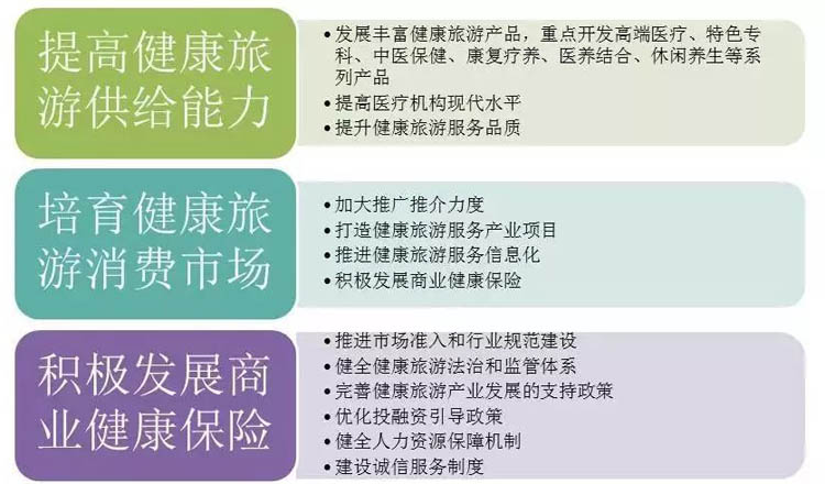 《指导意见》提出加强组织领导、推进试点示范、加强国际交流合作3条措施,通过建立健康旅游发展部门协作机制,发挥地方政府的引导和推动作用,建设健康旅游示范基地,推进体制机制创新,推动健康旅游业健康发展。