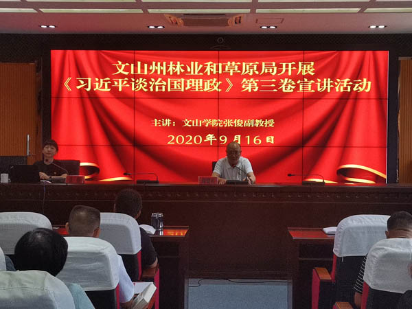 为认真学习宣传贯彻《习近平谈治国理政》第三卷,持续把习近平新时代中国特色社会主义思想和习近平总书记考察云南重要讲话精神不断引向深入,州林草局购买《习近平谈治国理政》第三卷书籍共106册,发放全体干部职工,实现人手一册。在干部职工自学的基础上,经积极请示对接州委宣讲团专家和精心组织,916日,州林草局开展了《习近平谈治国理政》第三卷宣讲活动。