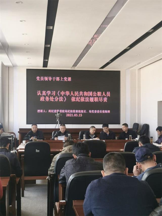 专题党课传达学习了《中华人民共和国公职人员政务处分法》的相关内容,通报了去年以来全州违法案件和违反中央八项规定精神的典型案例。