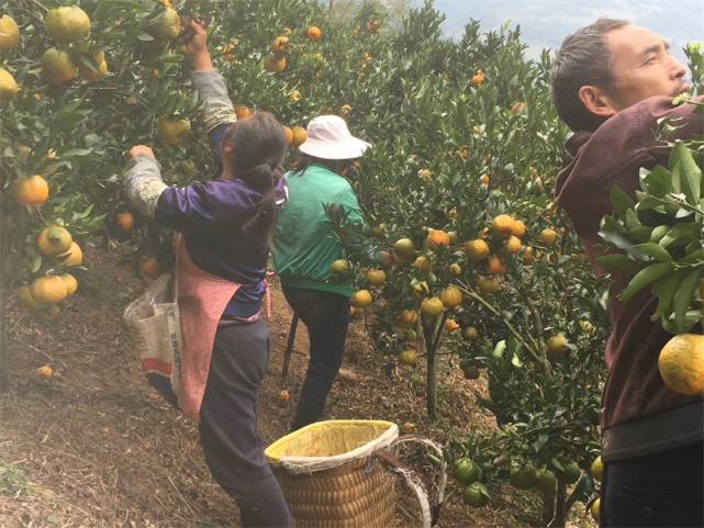 在村庄对面的山坡上,村民雷光凤正在采摘柑橘,由于今年受疫情影响,柑橘价格并不好,甚至没有客商进来收购,但雷光凤仍然信心十足。雷光凤曾是一名建档立卡户,但他不等不靠,早在10年前就开始种植柑橘,除了将自家的9亩山地全部种上之外,还向村民租了7亩多山地种植,靠勤劳的双手在16亩柑橘山地里淘金,近几年间每年收入在3—5万元左右。加上近几年文山市搬迁安置办公室提供技术指导和扶贫政策支撑,让雷光凤的柑橘产业得到更好更快发展,不仅让他实现脱贫摘帽,而且还是他全家7口人赖以生存的福地。