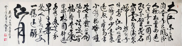 临池之外,许绍德认真研读历代先贤书法高论,遍购书法读物,博采众长,为其所用,形成了以“五韵”为精神内涵的书法风格。其书法气韵奕奕、情韵深沉、墨韵生动、线韵婉转、字韵有象。气韵是形与神之间的桥梁,是表达情性的介质。许绍德掌握了熟练技巧,运气达于毫端,以气行笔,点画之间气脉相通,气韵和神采表现得淋漓尽致。中国书法的笔墨具有丰富的表现力,许绍德常常通过行笔的刚或柔、粗或细、枯或润,来表现不同的韵味,达到形式上具有音乐的节奏感和艺术上的多样性之统一。线韵是中国书法主要的艺术语言,许绍德书法的起、承、转、合,通过张扬线条的韵律美,塑造出特定的形象,传达出丰富的情感。所谓“字韵”就是书法作品中字与字之间的韵律感。许绍德的书法主要表现为字之间的大小、疏密、轻重、浓淡、顾盼呼应等法理,宾主、虚实、避就、气脉连贯等。他把书法创作与美术构图原理相结合,做到形式与内容的有机统一,正所谓“书臻妙时书似画,画到佳处画如书。”