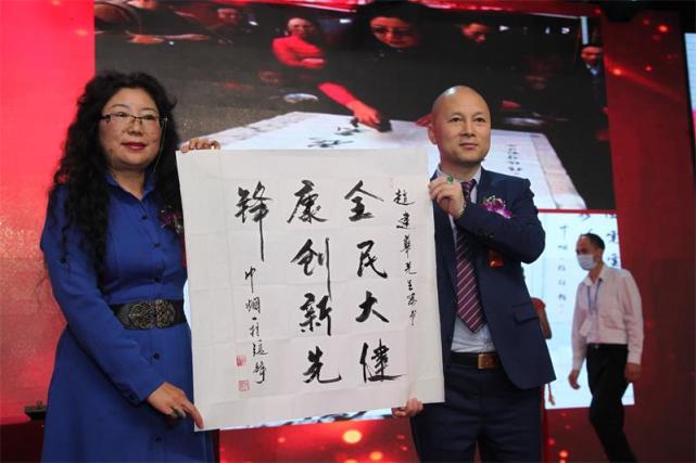 中国著名指书家、巾帼一指获得者、云南民族画院副院长张静(左)赠书法给中国全民大健康党组副书记、董事长赵建华