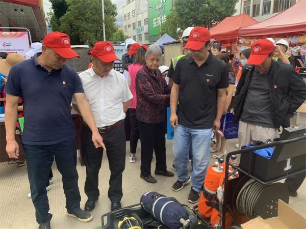 何建雄一行来到宣传活动现场,走到各成员单位宣传点,查看宣传资料,观摩云南大理中运危险化学品事故应急救援队新型器材,驻足观看救援器材使用演示,肯定活动组织有力,接地气,深受广大群众欢迎。