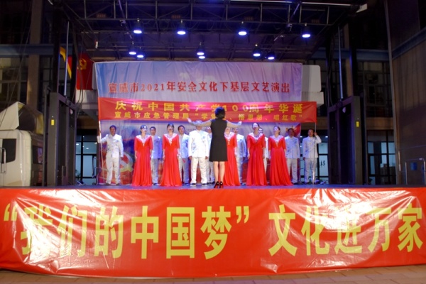 宣威市应急管理局结合安全文化下基层文艺演出活动,遴选《没有共产党就没有新中国》经典红色歌曲,将歌唱活动与上专题党课、重温入党誓词、党史学习教育有机结合,饱满的热情、洪亮的歌声受到现场观众的阵阵喝彩,大家用振奋激昂、情真意切的歌声向中国共产党成立100 周年献礼。