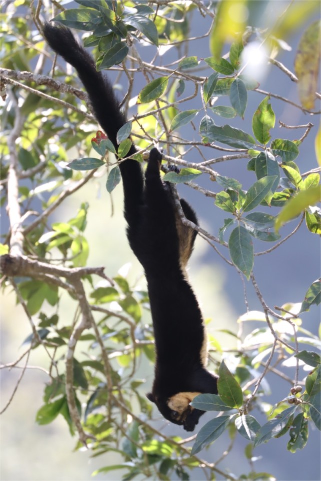 巨松鼠属国家二级重点保护野生动物,其成体体重可达3000克,超过40厘米的体长和长60厘米的尾巴,让它毫无争议地成为“松鼠界的巨无霸”。巨松鼠喜欢独栖,去年5月,龙陵县木城乡工作人员蔡双发在小黑山保护区内首次拍到两只巨松鼠“坐享美食”的画面,“实属罕见”。