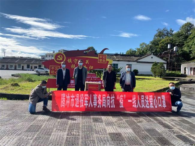 8月31日,腾冲市退役军人事务局分成三个小分队将6000只医用口罩和7500只普通爱心口罩分别送到定向的腾冲市滇滩镇、明光镇、猴桥镇三个边境乡镇。