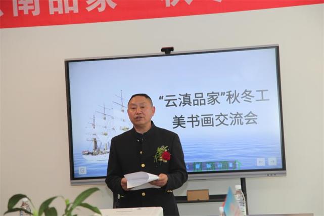 在会上云南品家商贸公司董事长梅富文致词:尊敬的各位领导,各位艺术家及在场的嘉宾大家下午好!在此请允许我代表云南贵品商贸有限公司全体工作人员对大家的到来表示热烈的欢迎及衷心的感谢!谢谢大家!