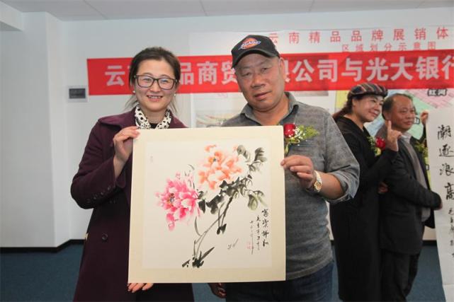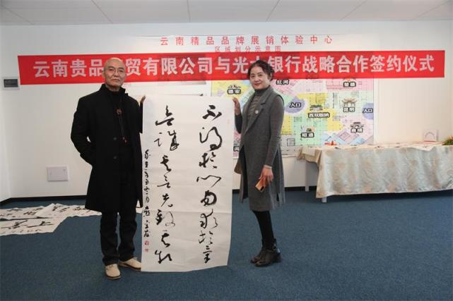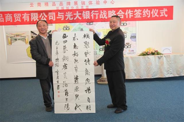 云南品家商贸公司董事长与中国光大银行昆明分行北京路支行行长杨丽娟在媒体和相关贵宾的见证下签订了银企合作协议,会议洋溢着热烈的气氛,书画作品也是满足不了书画爱好者、收藏者的需求,到夜晚还收不了场。会议达到了预期的效果,收获美满。