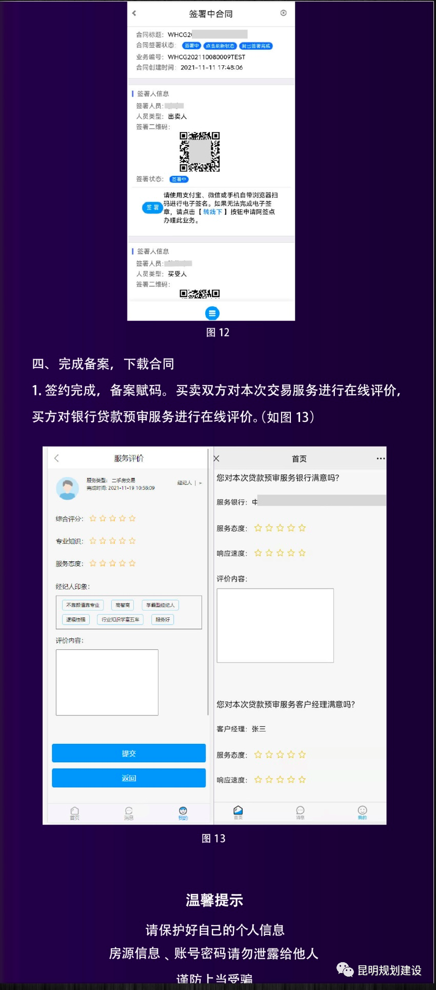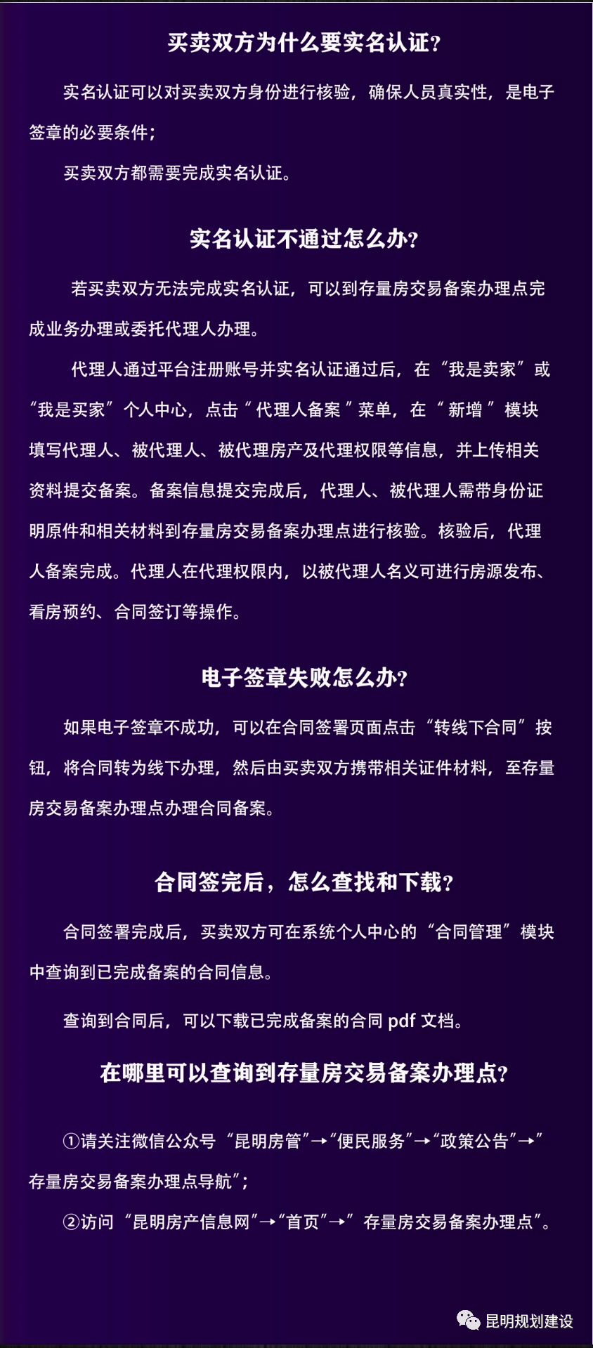“昆明市存量房交易服务平台”依托电子签章、人脸识别、区块链等技术,各方交易主体可使用该平台全线上办理存量房买卖合同网签备案业务,签订电子合同,实现了二手房买卖合同网签备案网上办、掌上办、就近办、自助办、异地办、即时办、不见面办。
