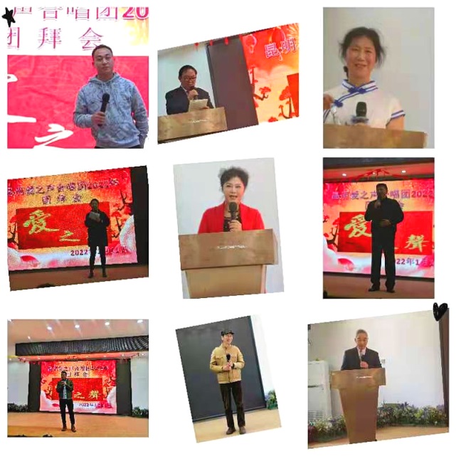 团拜会始终洋溢着欢乐的气氛。在倒数十个数之后,吴小惠等4名主持人登台献辞,拉开了团拜会的帷幕,闻洪团长、李兴贵副团长,王世滇书记分别上台讲话,总结回顾了爱之声合唱团2021年的排练、演唱、郊游等活动情况,并对表现突出的先进集体、个人进行了表彰奖励;对付出辛勤劳动的指挥陈永老师,钢伴李斗者老师,对关心支持、帮助过合唱团的4位嘉宾进行了亲切的慰问。