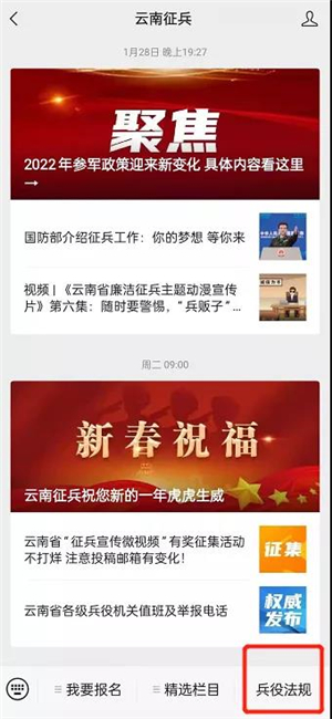 具体文件可登录全国征兵网查询,也可通过点击“云南征兵”微信公众号导航栏子菜单【兵役法规】进行查询。