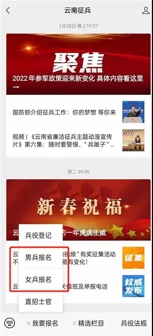 或手机关注“云南征兵”微信公众号,点击导航栏子菜单【我要报名】。