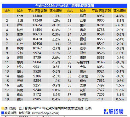 在全国38个核心城市中,本周贵阳的竞争指数仍最高,达到25.2,较上一周增长6.5,成都和西安的求职竞争也激烈,分列第二位和第三位。平均招聘薪酬最高仍是北京(13300元/月)、上海(13248元/月)、深圳(12624元/月)、杭州(11454元/月)四市。同时本周求职投递涨势较旺的城市集中在南方,主要分布在珠三角、长三角地区。深圳(42.4%)、佛山(37.4%)、广州(36.4%)和东莞(26.4%)投递简历量环比增幅较大。