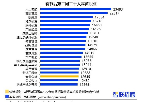 从行业角度看,本周基金/证券/期货/投资仍位于高薪行业排名榜首,平均招聘薪酬达到13019元/月,专业服务/咨询(财会/法律/人力资源等)行业薪酬环比增长4.5%,升至第二位,网络游戏行业薪酬环比下降6.1%,由上周的第二位降至第六位。能源/矿产/采掘/冶炼和电子技术/半导体/集成电路新晋上榜,特别是能源行业以5%的增速薪酬升至11428元/月,排名提升到第七位。其中,人工智能超越高管,升至第一高薪职位,本周平均薪资达到23483元/月,环比增长6.8%。