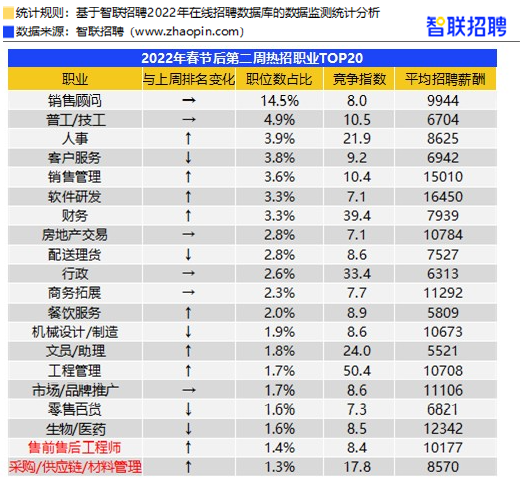 从职业方面看,本周互联网/电子商务招聘规模依然位居首位,占比一成。大型设备/机电设备/重工业行业进入招聘需求TOP10行列,售前售后工程师、采购/供应链/材料管理跻身招聘需求TOP20职业。节后第二周财务、人事等岗位招聘需求占比也环比上升,企业恢复生产和运营后对这些基础职能类岗位的需求增加,但求职竞争仍激烈,薪资水平也仍相对低。销售管理、软件研发等管理类或技术类职位招聘规模也有所扩张,竞争指数则相对小,平均招聘薪酬较为乐观。