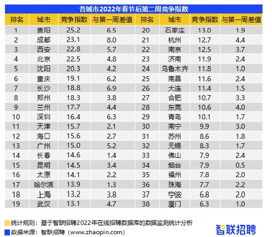 数据显示,2022年春节后全面复工的第二周,就业市场上招聘岗位持续释放,求职人才加速涌入。第二周投递简历量环比增加7.5%,竞争指数由上周的11.3上升至15.4,一个空缺岗位平均收到15份简历投递,求职热度升温。