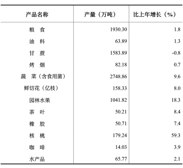 全年粮食总产量[6] 1930.30万吨,比上年增长1.8%。油料产量63.89万吨,增长1.3%;烤烟产量82.18万吨,增长0.7%;蔬菜产量2748.86万吨,增长9.6%;园林水果产量1041.82万吨,增长18.3%;茶叶产量50.21万吨,增长8.4%;鲜切花产量158.33亿枝,增长8.0%。