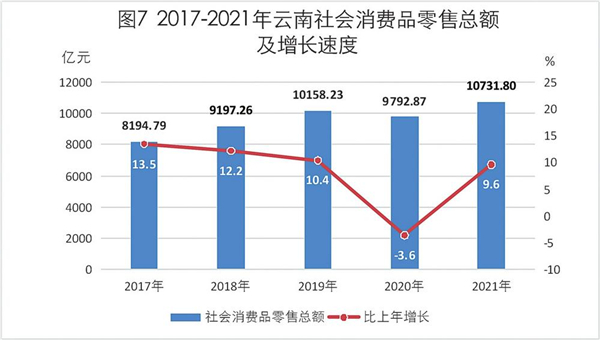 全年社会消费品零售总额10731.80亿元,比上年增长9.6%。分经营地看,城镇消费品零售额9345.38亿元,增长9.6%;乡村消费品零售额1386.42亿元,增长9.8%。分消费形态看,商品零售9230.70亿元,增长8.6%;餐饮收入1501.09亿元,增长16.4%。