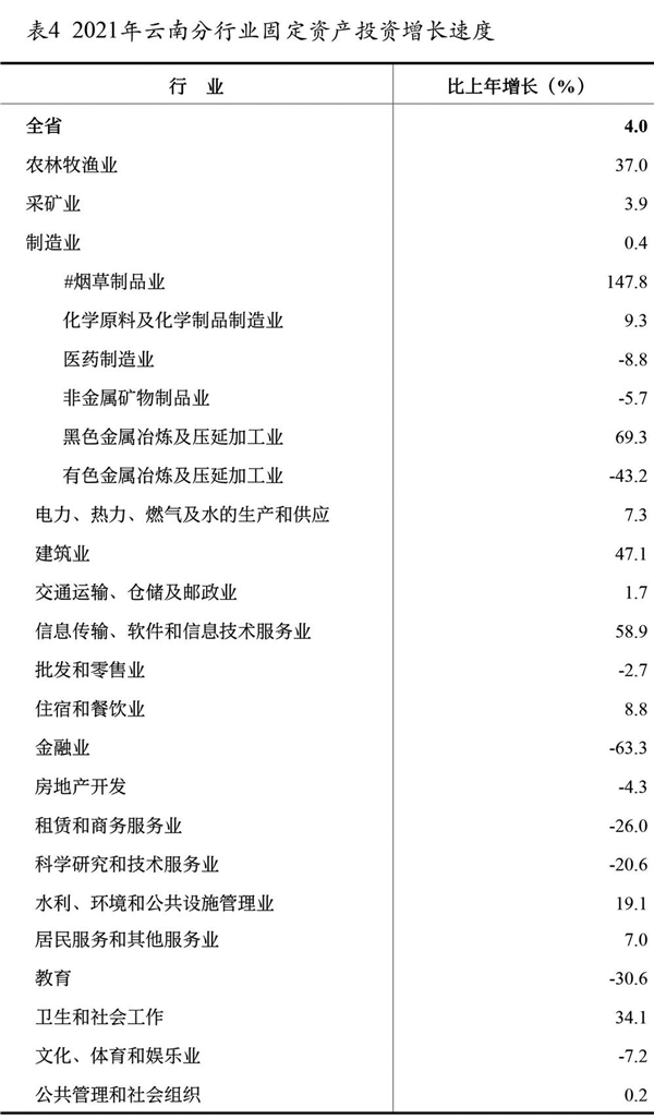 全年固定资产投资(不含农户)[10]比上年增长4.0%。分三次产业看,第一产业投资增长30.0%,第二产业投资增长2.8%,第三产业投资增长2.1%。