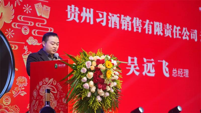 贵州习酒云南大区总经理吴远飞在答谢会上致辞:贵州习酒公司从1952年建厂至今,已经走过了70年的发展历程。70年来,贵州习酒公司始终秉承匠心匠德,坚守″发展、生态、安全、质量"四条底线,以传统古法酿造工艺,酿造出醇香优雅的高品质白酒。同时,也积淀了'崇道,务本,敬商,爱人"的核心价值观,并在此基础上形成了全国白酒企业中独树一帜的″君品文化"。云南醉临风酒业与贵州习酒、携手十年,风雨同舟,砥砺前行,取得了可喜的成绩,这是云南醉临风酒业全体员工,以及在座各位大力支持的结果,非常感谢大家。
