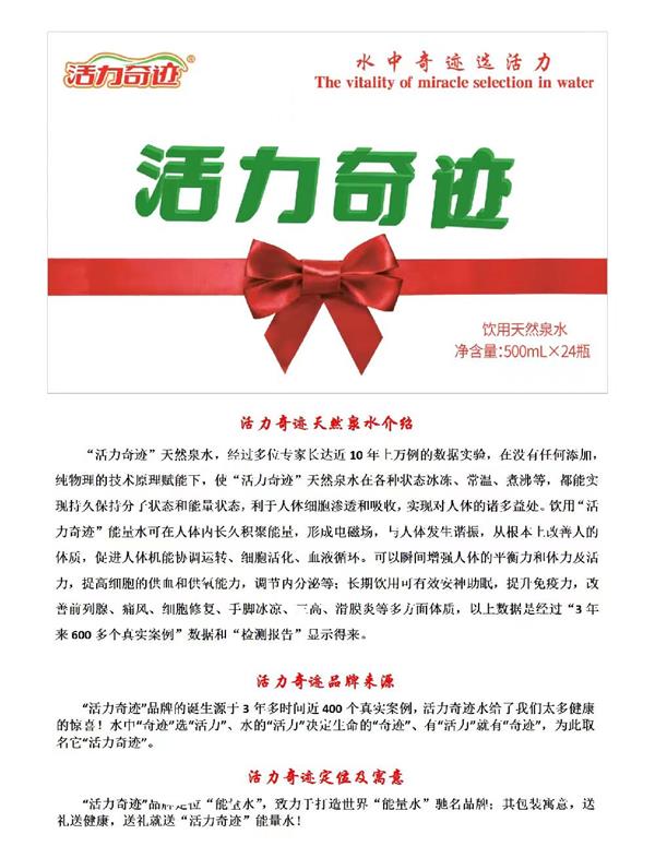 本次推出的"活力奇迹"天然泉水,是通过多为专家长达近10年上万例的数据实验,在无任何添加、纯物理的科技原理赋能下,使“活力奇迹”水在任何状态下(常温、冰冻、沸腾)等都能持久保持能量状态和分子状态,长期饮用可辅助改善睡眠、提高免疫力、手脚冰凉、痛风、滑膜炎、人体细胞、三高等多方面体质,以上数据是通过三年多600多个真实客户数据以及检测数据报告得来。