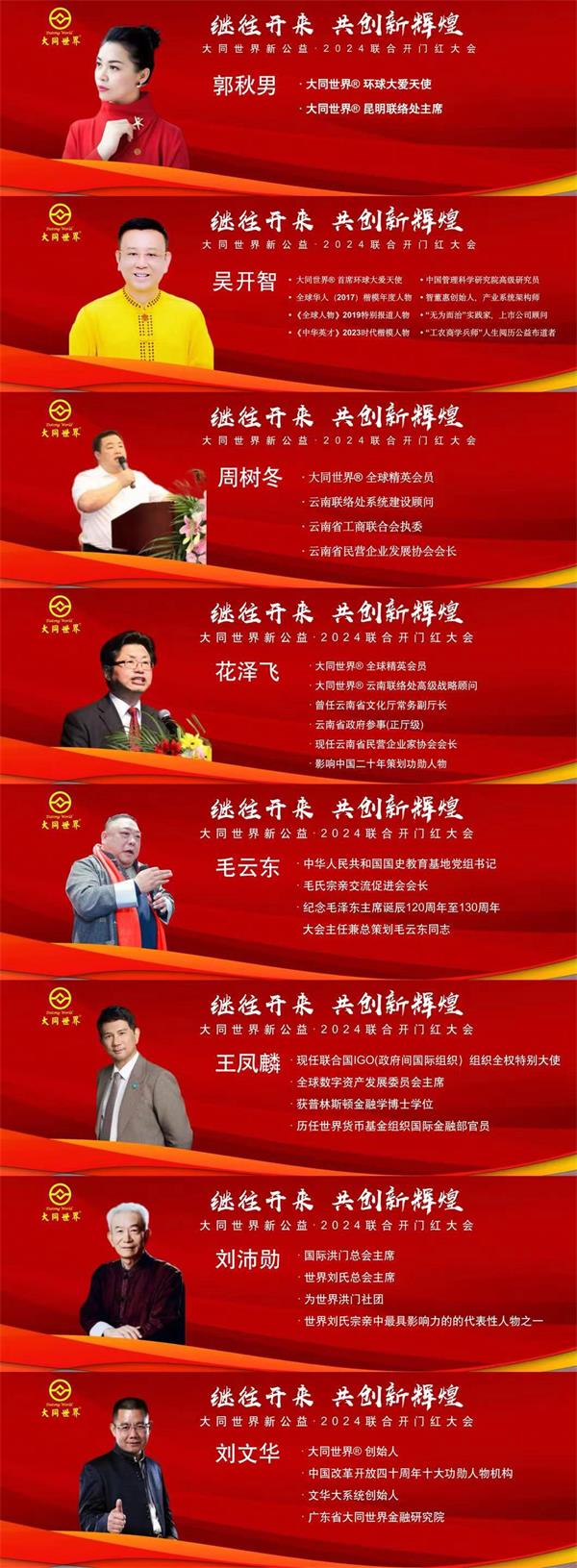 龙腾虎跃迎新春,前程似锦开门红,大同世界新公益.2024联合开门红大会,3月3日下午,在春城昆明云安会都国际厅隆重召开!大会以″继往开来,共创新辉煌"为主题,回顾文华大系统.大同世界十多年发展历程,展示阶段性成果,规划联合共赢发展蓝图!本次盛会主办方:大同世界第三届全球兼爱天使委员会,承办单位:大同世界云南昆明联络处、大同世界文化发展有限公司、支持单位:大同世界全球战略委员会、大同世界金融研究院及全球各区城联络处、全球华侨领袖总联盟、国际洪门中华总会、环球商协会联盟、"一带一路"经济文化发展中心、中国普洱茶协会、云南民营企业家协会、云南省西部发展促进会、云南小微企业发展促进会、云南道路桥梁施工行业协会、云南省诚信企业协会等。联办单位:深圳仟枝生物科技有限公司、云南凯特电子技术有限公司、超抗(海南)生物科技有限公司、大同世界北京产业园、昆明济康囗腔、云南佳联大数据服务集团有限公司、昆明邦尔囗腔、云南吴氏嘉美医疗美容医院集团有限公司、聚缘百岁养生堂、云南天韵古茶坊茶叶有限公司、昆明玉润珠宝、昆明快手汽车服务有限公司、云南远声茶文化传播有限公司等。协办企业:云南水当然商业管理有限公司、大同世界(深圳)经济发展咨询有限公司、深圳市皇家金盾智能科技有限公司、贵州季台酒业有限公司、肇庆水森林生物科技有限公司、遵义1935酒贵州汪世家酒业、氧动健康产业有限公司、云氢分子医学科技(云南)集团、佳联影视(云南)集团有限公司,来自五湖四海、齐聚一堂、世界名人,商界精英近1500人出席本次盛会。