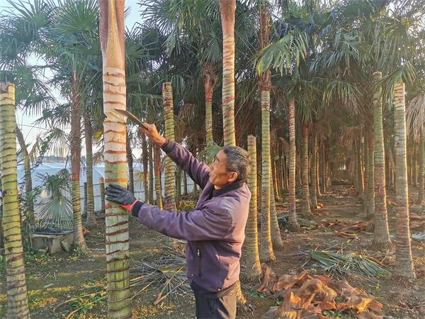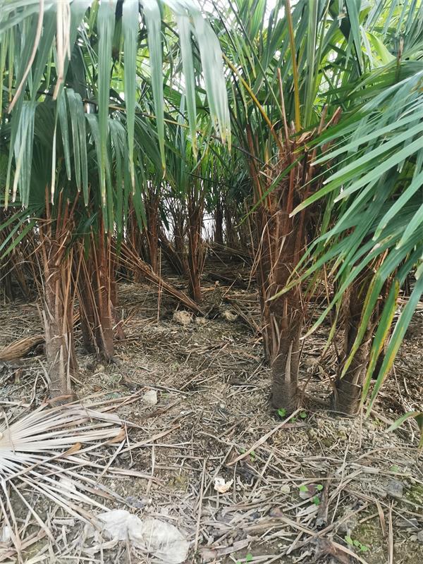 市林业局退休高级园林工程师说:“甜棕规模化连片栽培,最好是栽培三年以上苗龄的植株。株距是70厘米,行距是100厘米,这种栽培密度,一是叶片呈65度夹角斜上方生长,叶片相抵遮挡阳光对土壤的照射,减少水分蒸腾,耐旱的甜棕长得快。二是叶片遮挡了阳光水分,树空杂草不易生长,减少除草劳力。三至四年可以砍头时,砍二留一出售甜棕头,可以回收前期投入成本,剩下的一株2米的株行距,恰好是收剥棕包米的科学间距。”