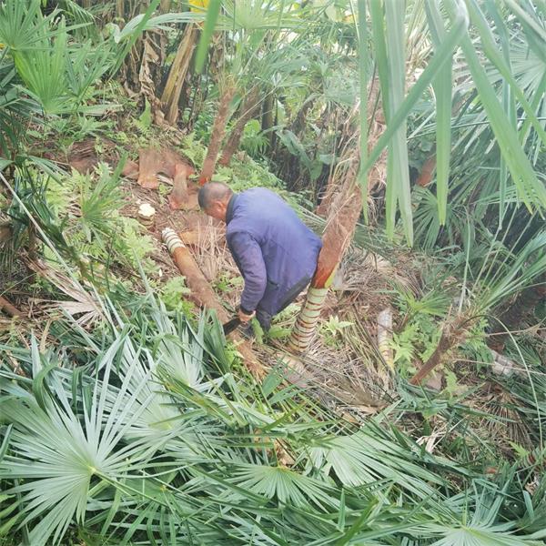 采访期间,恰逢施甸县由旺镇农民杨定国采购棕苗,他说:“前几年搞建筑积攒了几万块钱,投资什么也拿不准,就在自己的21亩山地上种植甜棕苗,先种十亩三年苗,再采购60公斤种子,自己育苗慢慢栽培,三年时间种满,七八年时间自己满60岁,管理棕树无技术含量,除草施肥投入劳动力不多,也算是给自己种一片养老树。”