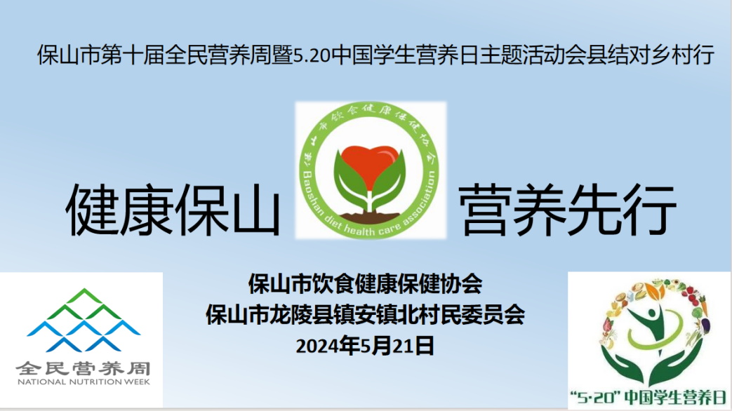 5月21日,保山市第十届全民营养周暨会县结对营养健康知识普及助力乡村振兴健康促进行志愿服务活动在龙陵县镇安镇北村新时代文明站举行。活动以“健康保山,营养先行”为主题,旨在提高村民的健康意识和营养水平,进一步推动健康村镇建设。