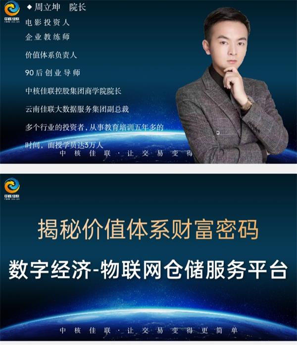 中核佳联集团商学院院长周立坤院长在本次盛会上,揭秘价值体系财富密码,数字经济一物联网,是实体经济复兴的新跑道。中核佳联价值体系的核心是:共建、共创 、共融、共享。打破传统商业思维,突破货币流通局限,以解决问题为导向,通过物资价值数字化将其价值完全释放,以仓储服务记帐货单为工具,重构财富及信用,从而共建数物融通经济共同体。中核佳联数字经济一物联网平台,帮助360行的企业物资、技术、服务等融入记帐仓库。中核佳联运用价值体系打造产业生态链:在全国找1万家过亿级企业成为股东企业,找10万家过千万级企业成为合伙人,找100万家实体企业成为联盟商家。万家企业共聚力,万亿资产解难题。一、从万家亿万级企业中,挑选出所需解决产品资金难问题,同时解决销售难的问题;二、从万家企业中挑选出相关产业的上、中、下游形成产业链。