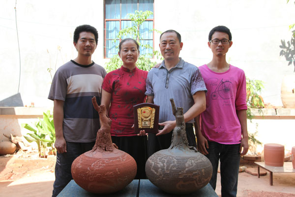 “笛龙陶艺”工作室陶艺师范成雄大师(右二)、经理周冬英(左二)、陶艺师范文笛(左一)、陶艺师范文龙(右一),陶艺作品《殇》获“2013年第十四届中国工艺美术大师作品暨国际艺术精品博览会‘国信·百花杯’中国工艺美术精品”金奖