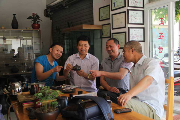 在笛龙陶艺展销部范成雄大师(右二)向记者钱丙申(左二)、书法家燕金发(左一)、铜雕艺术家汪金鹏(左一)介绍陶艺产品
