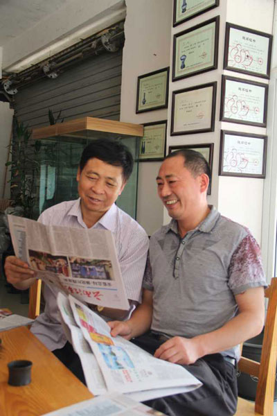 《云南法制报·经济聚焦》主编钱丙申(左)向范成雄大师(右)介绍报纸内容