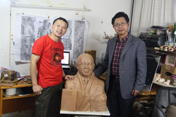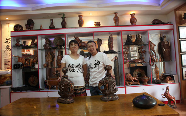 在记者采访的众多艺术人物中,汪金鹏夫妇绝对是最特别的,他们终日与泥为伴,把名人以及各种形态的物品,通过他们的鬼斧神“雕”,变成一件件精美的斑铜艺术品。由于他们夫妇二人都是从事雕刻艺术,且夫唱妇随、琴瑟和鸣,因此云南艺术界的朋友们送了他们一个雅号——“神‘雕’侠侣”。