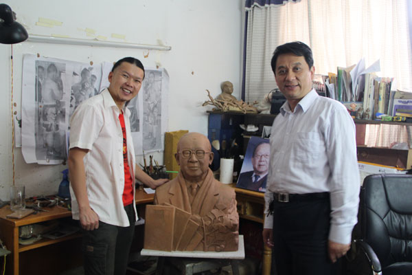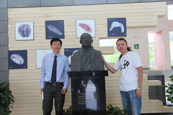 中国科学院昆明植物研究所所长李德铢(左)与雕神艺术馆汪金鹏(右)在中国科学院院士、著名植物学家吴征镒青铜雕像揭牌仪式合影