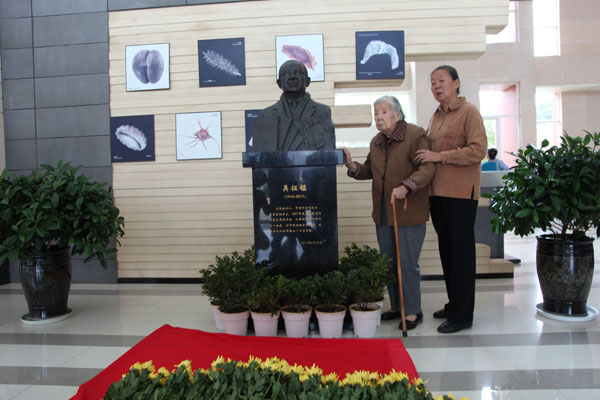 中国科学院院士、著名植物学家吴征镒的爱人和女儿观看青铜雕像