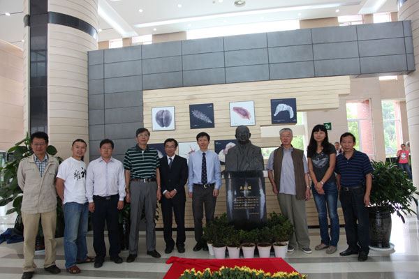 中国科学院昆明植物研究所相关领导及研究人员与雕神艺术馆汪金鹏(左二)在中国科学院院士、著名植物学家吴征镒青铜雕像揭牌仪式合影