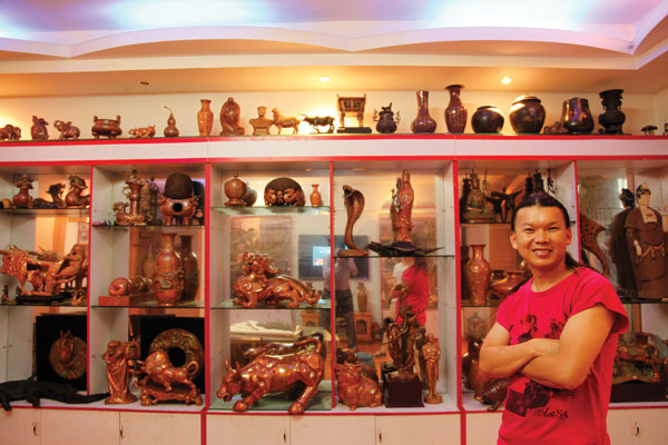 在汪金鹏的雕神艺术馆中,随处可见一些酒樽、宫灯等以古代文物为原型的斑铜雕塑作品,名家书画。汪金鹏说,这些文物的造型本身就已经非常美观了,而且都具有很深的文化底蕴和很强的艺术感染力。而自己现在不仅会用雕塑的形式把他们复制出来,还要加上一些新的东西,比如玉石、珠宝、银饰等,让他们更加好看和更具有价值。他幽默地说:“有些古代器物都是皇帝用的东西,我把它复制出来之后,就让老百姓可以用上皇帝用过的东西了,而我再加上其他的饰品,就成了好多名人都没有用过的东西了。”