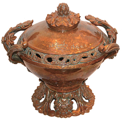 斑铜是云南特有的民间传统工艺品,至今已有300多年的历史。斑铜工艺制作复杂而严格,采用的是高品位的铜基合金原料,经过铸造成型、精工打磨,以及复杂的后工艺制作而成。斑铜有“妙在有斑,贵在浑厚”的独特特点,因其褐红色的表面呈现出离奇闪烁、瑰丽斑驳、变化微妙的斑花而独树一帜,堪称金属工艺之冠。斑铜因斑而闻名,能出斑才是好的作品,因此烧斑也就成了斑铜制作过程中最考究的一项工序。其自然烧炼、通风、升温、时间长短、火候的把握都有严格的要求,汪金鹏在一开始制作斑铜的时候,也经历了一次次的失败,是妻子的鼓励和对艺术的追求才让他坚持下来,并最终获得了成功。