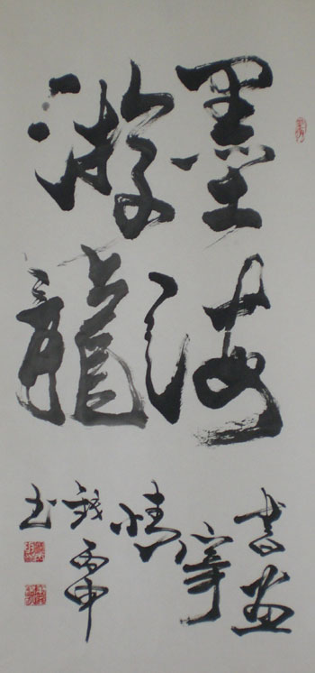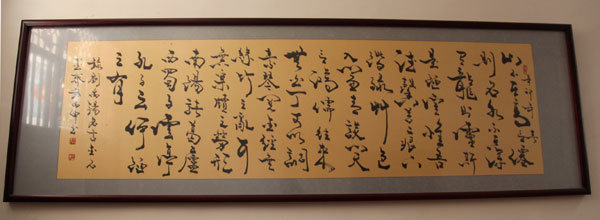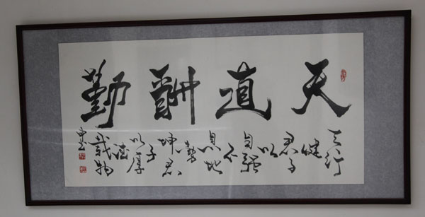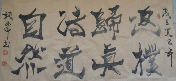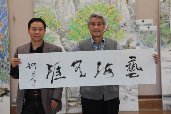 著名军旅画家钟开天(右)为钱丙申题字“艺海无涯”