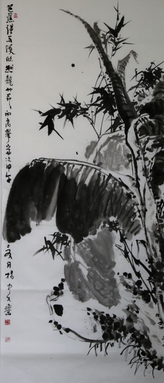杨中文的画风,看似粗疏的随意挥洒,实则处处深藏,苦心经营。哪怕一笔一画,都包含着深邃的立意、丰厚的含蕴,因此他的作品品位很高。他善于运笔用墨,尤其在运用墨色处理虚实关系,营造枯润相生、老辣生动的艺术境界上,更有独到之处。他说:“画虚处犹如音乐中的低音,音低尤重,最见工夫。”所以他的画笔墨淋漓,气韵生动。他认为学习中国画,继承传统固然重要,但更重要的是创新,而要创新则必须注意三点:一是要有生活。没有生活,任何创新都成了无源之水,无本之木;二是要有工夫。即所谓艺术技巧与方法,非一朝一夕所能掌握,要勤学苦练,方可有成,所谓“天道酬勤”就是这个道理;三是要有传统文化的博大涵养。这就要多读书,多揣摩前人的作品,深入理解所画的题材和内涵。
