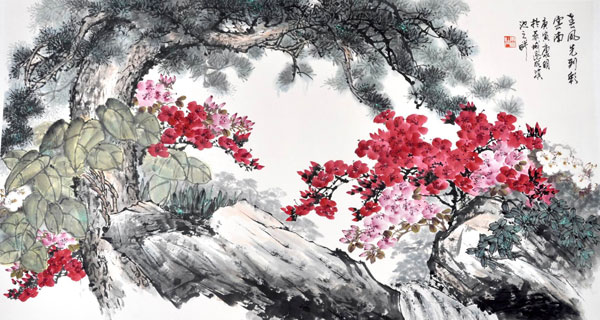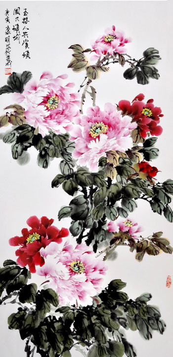 中国历代画牡丹者众多,其作品大同小异,多是一些花枝招展,脂粉浓烈之作,而康明笔下的牡丹却生机勃勃,犹如出水芙蓉,滋润透彻,艳而不俗。究其原因,源于她画牡丹纯属是对生活的感悟,朴素而典雅。康明以其独特的艺术语言诠释着牡丹“国色天香”的风骨神韵。