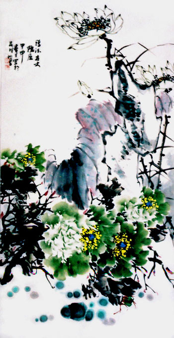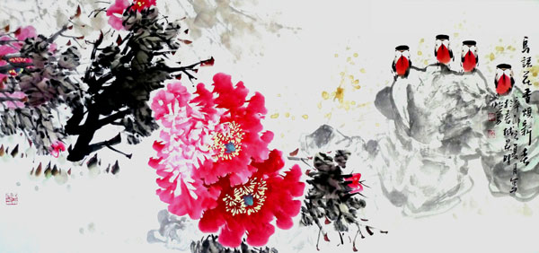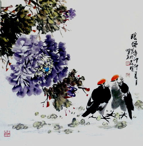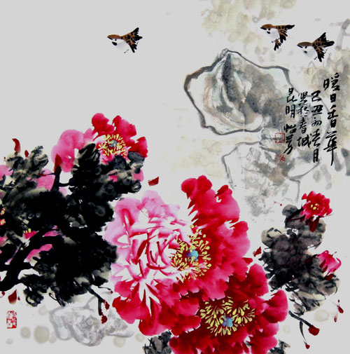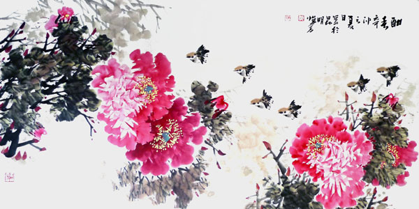 怡芳女士天生丽质,聪敏有慧根,画风清丽,得牡丹神韵,人称“郭牡丹”。余观怡芳丹青,笔墨既中规矩,画风亦近性情,花即人,人即花,人花一体,此所以画出心机,画花即是写心也。子曰:“天何言哉,四时行焉,百物生焉,天何言哉。”夫人间花鸟,自然造化,因缘和合,无言而有大美;外师造化,中得心源,天人合一,必见真性情。画花亦为修行,修到牡丹真品性,则明月天心,拈花微笑,德三昧矣。