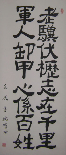 为了实现写文章到写书法的转变,杨统时把退休生活当做学习书法的第二个春天,每天早上7点起床,练罢1个小时再吃早点;上午还有习作书法的“午课”,晚间有练书法的“小自习”。退休七年来,杨统时临遍了张猛龙碑、张迁碑、曹迁碑、兰亭叙、王羲之十七贴等名家名贴、篆书、隶书、行书、一年主攻一书。