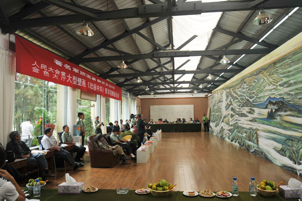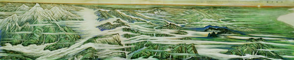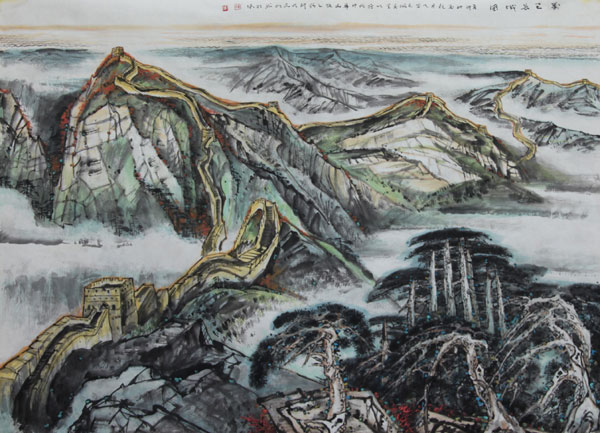 2、作品注重意境,恢宏雄健,代表国家文化形象。大型绘画作品气势恢宏,壮丽辉煌,满溢祖国繁荣富强之盛景,充满中华文化自信之风范,陈列于重要外事、会议、接待等活动场所,其独到的创意构思,宏大的画面构图,冷色的厚重和暖色的绚丽配置,以及融东西方为一体的高超绘画技巧,博得党政军各界的广泛赞誉。目前,已创作陈列于中央党政军机关的作品有七幅,最近又接到人民大会堂创作五幅大型壁画的任务,全部共十二幅。其中,中南海紫光阁壁画一幅;人民大会堂金色大厅壁画《壮丽中华》(18M×3.72M)、云南厅壁画《七彩云南》(与李忠翔合作,12M×3.6M);中央军委礼堂壁画《山花烂漫》(135M×2.65M)、军委八一楼外宾厅壁画《绿色瑰宝》(13.5M×2,65M);国防部外事人厅壁画《中华魂》(5.418M×3,967M)、国防部宴会厅大幅壁画(早期作品)。还有全国各大军区和省市、自治区办公设施均有其巨幅力作陈列、收藏。如:宁夏壁画《塞上风物图》(10M×3M),云南省委壁画《绿色瑰宝》(4.96M×2.4M)、《瑞祥春和图》(2.0M×4.7M),云南省政府壁画《山花烂漫彩云南》等等。钟开天已经成为当代中国画大型作品入选中央和地方党、政、军重要外事活动场所数量最多、入选率最高的画家,其艺术成就在云南美术史上首屈一指,在解放军艺术史上功勋卓著,在当代中国美术界也为数不多。
